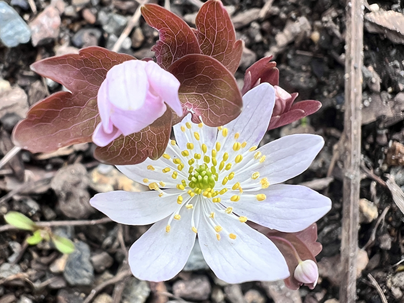 Bloodroot (Sanguinaria canadensis)Bloodroot is a low plant growing only up to 10" high. It spreads rapidly and makes an excellent ground cover that can be used around the base of trees. It can grow in full sun but likes shade. It gets its name from the roots that contain a blood-like juice. It is naturally deer resistant. Bloodroot is actively being studied for use as an anti-cancer agent, particularly for the treatment of skin cancer.