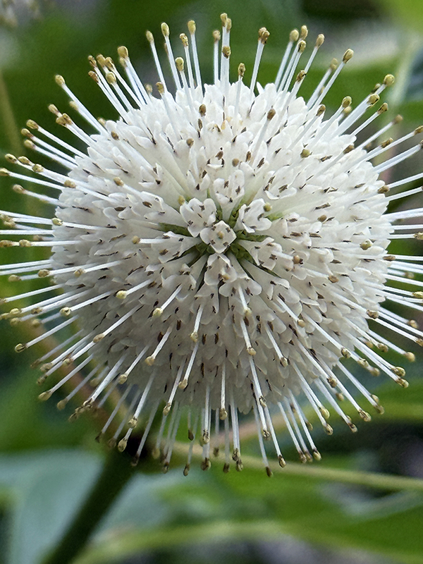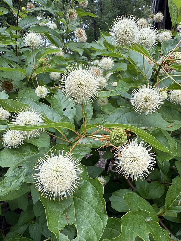 Now blooming in our native gardens, common buttonbush (Cephalanthus occidentalis) is a distinctive ornamental shrub with fragrant, creamy white flowers that stand out against glossy dark green leaves. The globe-shaped blooms, which resemble pincushions, appear in July and August, followed by fuzzy, button-like seed clusters that give the plant its name.