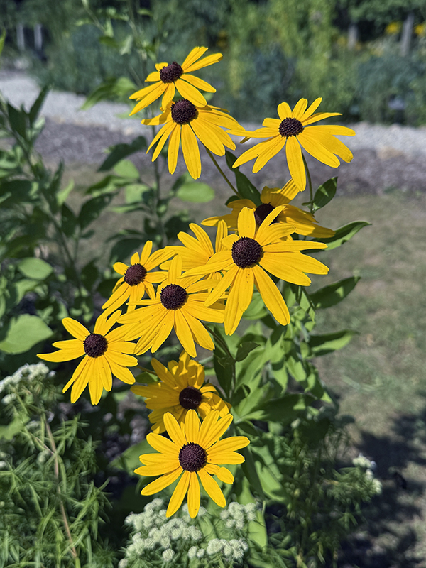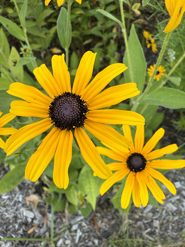 We spent some time in our garden trying to figure out which were the black-eyed and brown-eyed species, since we knew both were part of our mass planting garden. Black-eyed Susans are a true perennial that will return year after year, while some brown-eyed varieties are considered to be short-lived perennials or biennials that reseed freely, giving the effect of a perennial. The yellow flowers all have dark brown to purplish centers, but black-eyed Susans have larger flowers with smooth leaves and stems. Brown-eyed Susan tends to be bushier plants and have clusters of smaller flowers with rough, hairy leaves, stems, and branches. We can report that trying to tell the two apart is not easy, even a plant identifying app on your phone will struggle to differentiate the two.