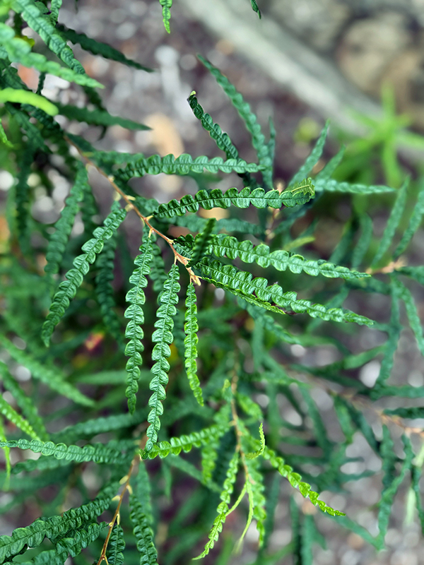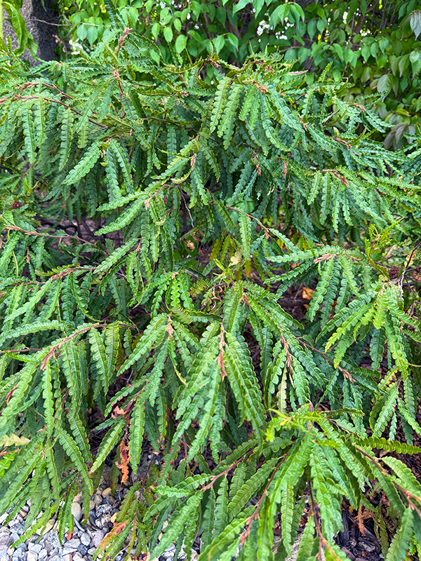 As we head toward fall and most plants in our native gardens begin to go dormant, sweet fern (Comptonia peregrina) continues to grow vigorously. Though not known for its flowers, this is an interesting and hardy plant, especially well suited for naturalized areas where it can be left to spread and form colonies. Sweet fern does well in poor soil and can be used to stabilize slopes. Despite its name, it is not a true fern but a small, aromatic, mound-shaped shrub that grows two to four feet tall. Small brown flowers appear in spring before the leaves, which resemble ferns, unfold.