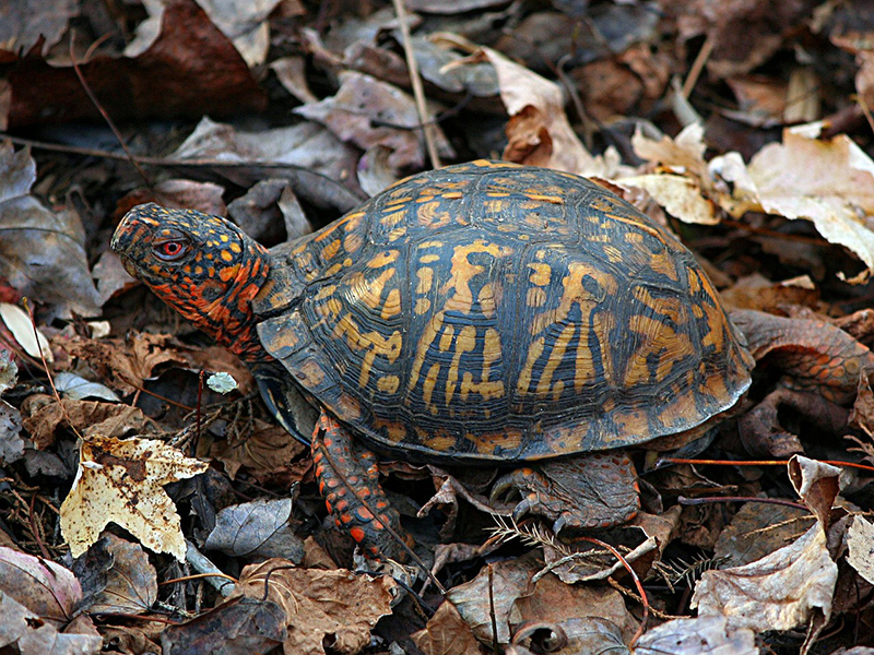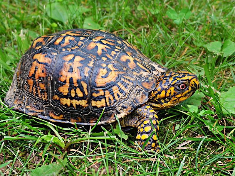 Known for its distinctive, domed shell with vibrant patterns, the eastern box turtle is easily recognizable amongst other turtle species in New Jersey. These critters are also unique from other turtles because they have a hinged shell that allows them to completely close themselves off from the outside world (hence the name “box” turtle), which can provide excellent protection against predators like raccoons and opossums.
