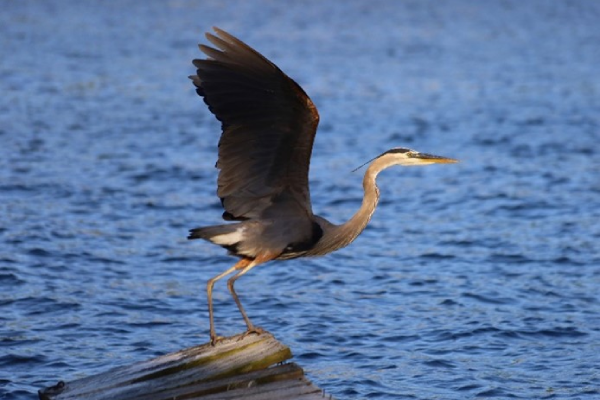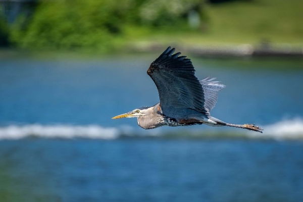 One of the most recognizable sights on Lake Hopatcong is the great blue heron. Distinguished by its unique appearance, it boasts a long neck, beak, legs, and wingspan that set it apart from other birds. As North America's largest heron species, it can span up to 6.5 feet, yet weighs only around 8 pounds at its heaviest. Known for their patient hunting style, they often wait motionless for extended periods, relying on their long necks to snatch their prey. In flight, they retract their necks, resembling modern-day dinosaurs in their majestic glide. Considered by some to be an indicator species, these birds can often give a warning as to when water quality is beginning to degrade. Without healthy prey available to feed on, the Great Blue Heron will relocate to a different area where they can more easily find prey.