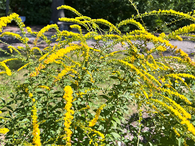 Fireworks Goldenrod (Solidago rugosa)Once under consideration to become America's national flower, Goldenrod produces much of the color along American roadways in the fall. Goldenrod grows 1' to 3' tall and produces yellow clusters of flowers that bloom all along the purplish stem. Butterflies and bees seek nectar from the flowers. Goldenrod hosts caterpillars of several moth species. Its seeds are eaten by songbirds. It is a misconception that Goldenrod causes hay fever or allergies.