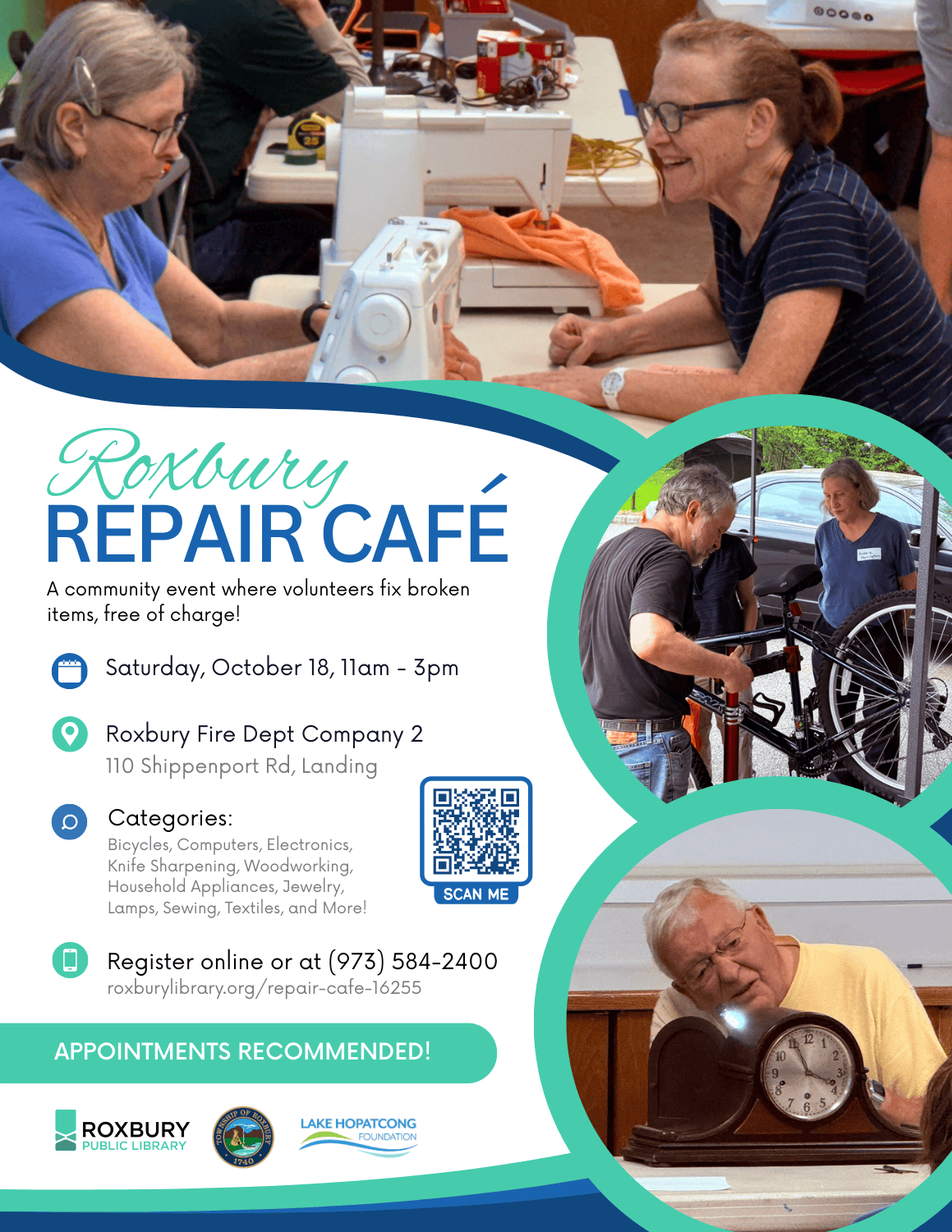 Following the success of the first Repair Café this spring, we, along with our partners, the Roxbury Public Library and Roxbury Township Recycling, are teaming up again to offer a free community day of fixing, learning, and connection. More than 20 skilled volunteers will be ready to tackle a wide variety of repairs, including: