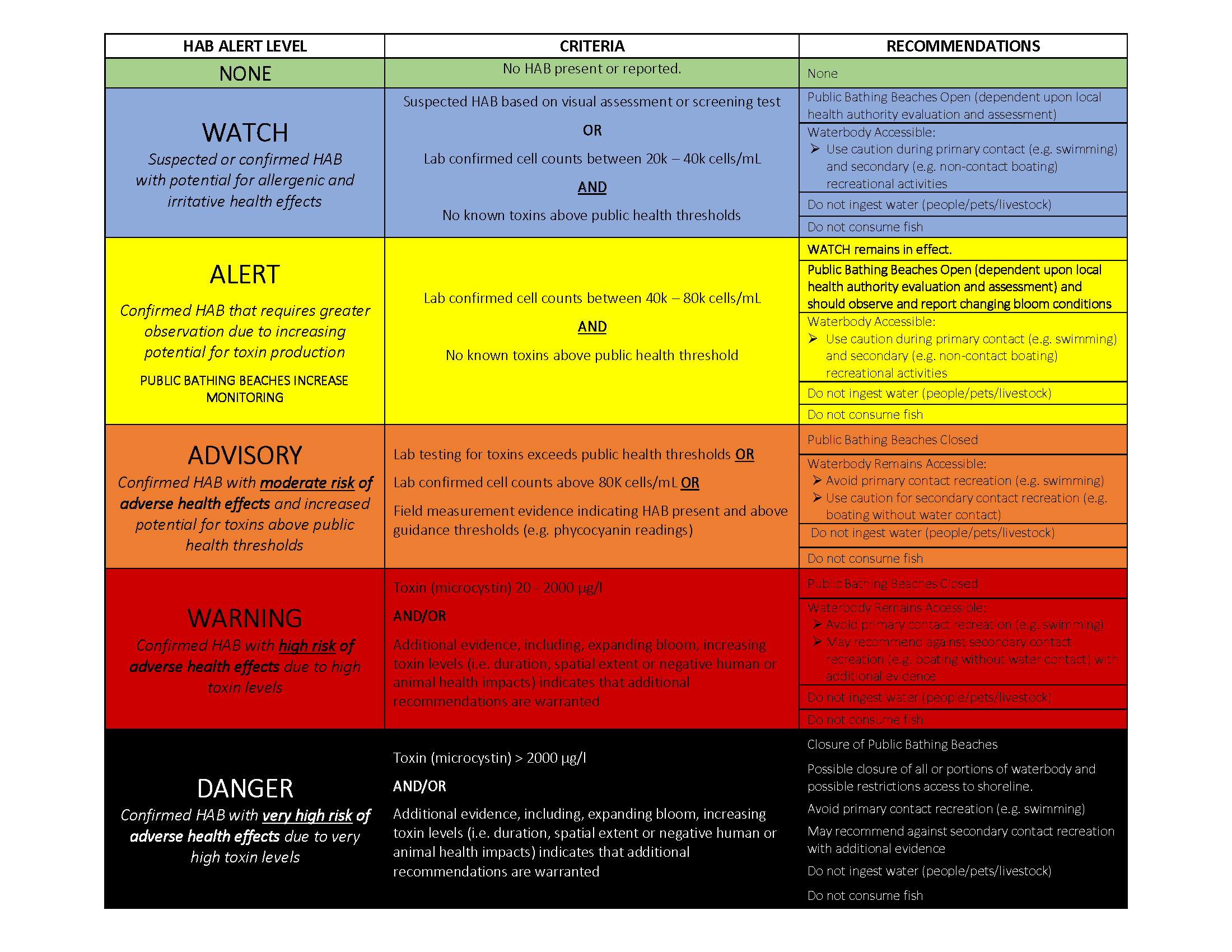 Currently, there are advisories at the NJDEP WATCH level at each of the three sites. At the WATCH level, there are cyanobacteria concentrations of 20K - 40K cells/ml. These are suspected or confirmed HABs with potential for allergenic or irritative health effects. Public bathing beaches remain open, but caution should be used during primary contact activities such as swimming. Do not ingest the water, and do not consume fish. It is also advisable to keep your pets away from the water as they are very sensitive to bacteria and may drink the water or lick it off their fur.