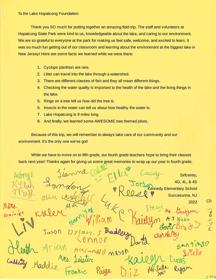“I wanted to pass along a huge thank you for an amazing field trip. Please see the attached thank you note we created as a 4th grade to express our sincerest gratitude for an awesome experience... Overall, it was a great experience for these Kennedy fourth graders. Thank you for all that you do at the Lake Hopatcong Foundation.” - Sarah Goodyear, Kennedy Elementary School, Succasunna