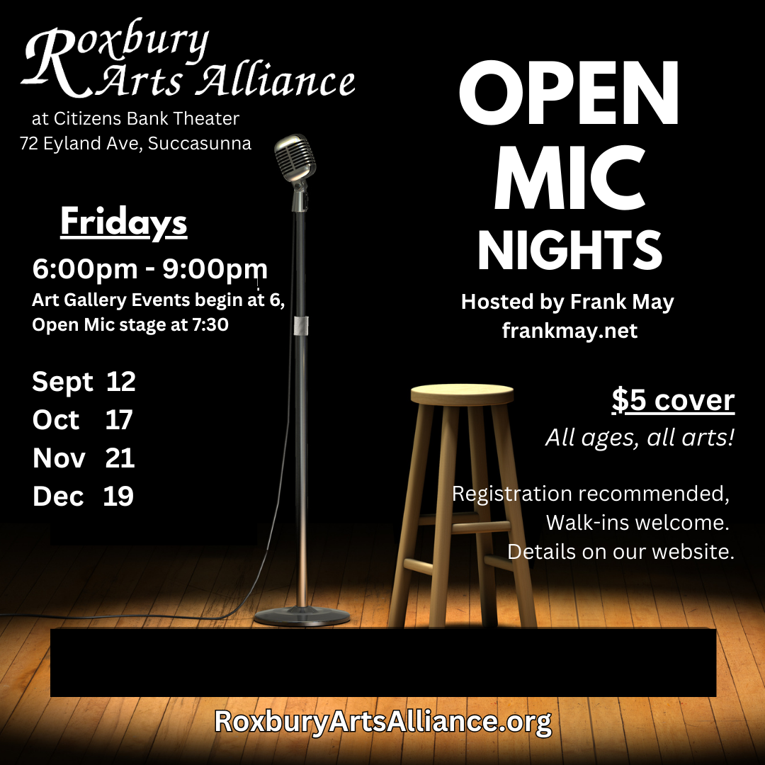 Show off your talent, practice some new material, get a feel for the stage and lights, share your creations- whether it's your first time or your fiftieth (or more)! The Roxbury Arts Alliance offers a fun and welcoming environment for an all-arts open mic session. Bring your music, voices, poetry, comedy, performance, or visual arts. Have fun participating, observing, and supporting your friends, family, and community members!