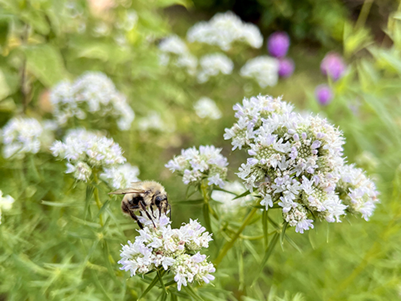 Narrow Leaved Mountain Mint (Pycnanthemum tenuifolium)A narrow-leaved species of mountain mint with an upright habit reaching up to 3' tall and growing about 2' wide. Blooms are small, white clusters, which attract animals of all kinds. Mountain mint is a favorite for native bee species, as well as butterflies. Has a minty aroma when the leaves are crushed.