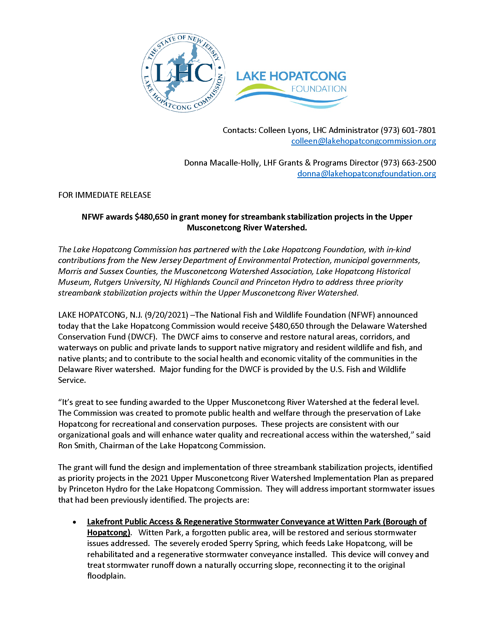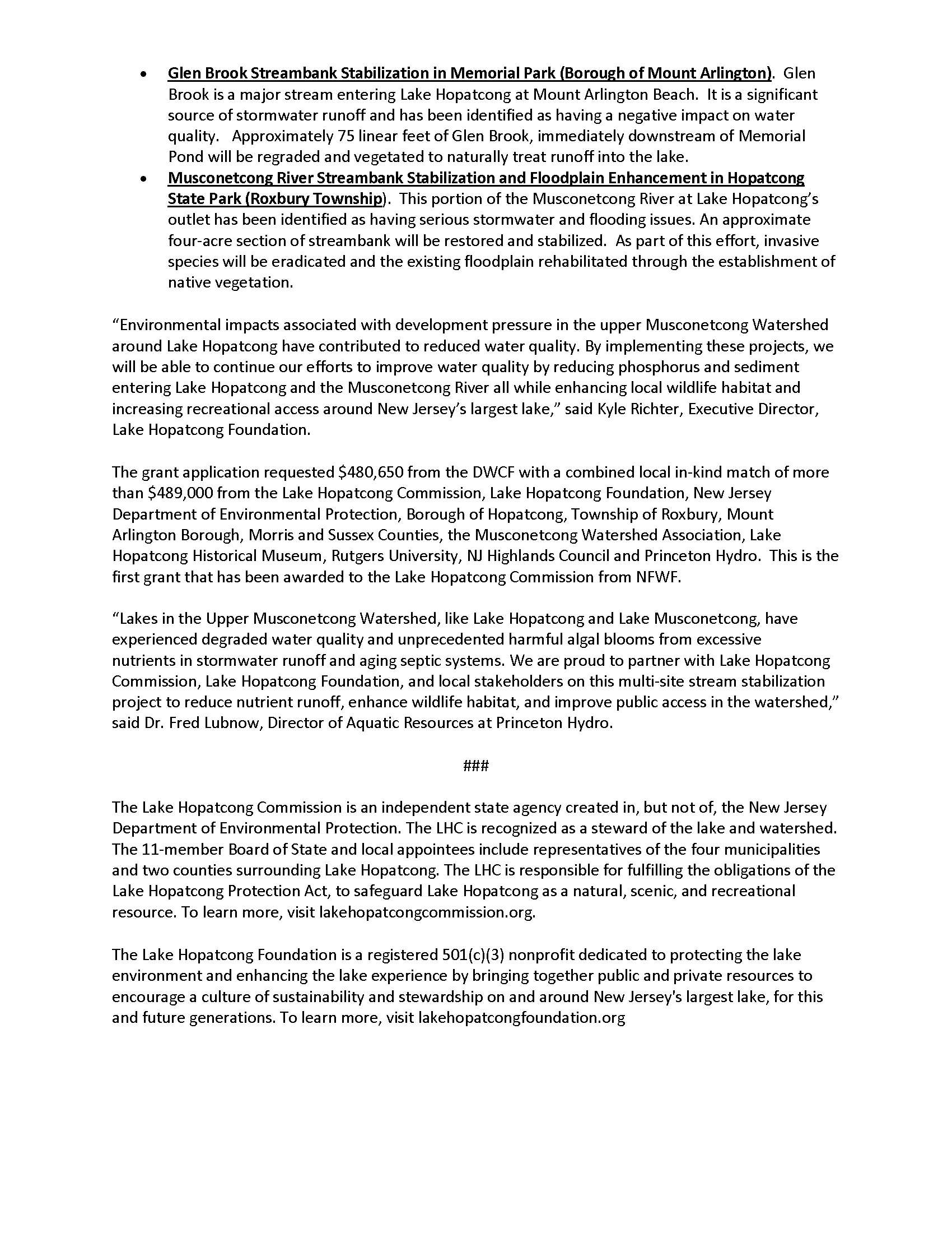 The grant will fund the design and implementation of three streambank stabilization projects, addressing stormwater issues within the watershed. Project areas include Witten Park in Hopatcong, Memorial Park in Mount Arlington, and Hopatcong State Park in Roxbury. Details on the projects can be found in the official press release below.