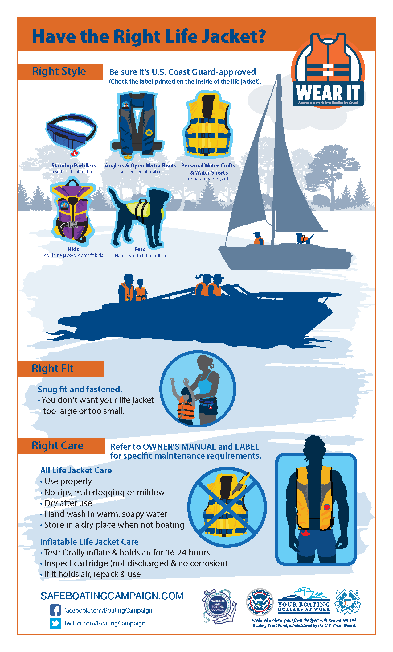 Check your life jackets at the beginning of the boating season to be sure that they are still in good condition. Any torn or deteriorated ones should be discarded. When buying new ones, verify that they are U.S. Coast Guard approved, on the printed label inside of the life jacket.
