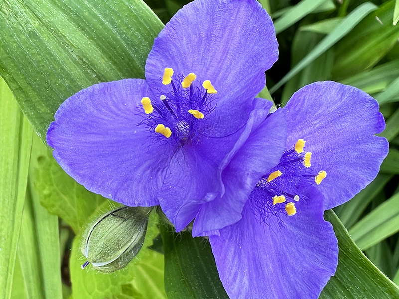 Spiderwort (Tradescantia virginiana)Virginia spiderwort is a hardy native wildflower known for its delicate, three-petaled blooms in shades of blue, violet, or purple, each with striking yellow stamens. The flowers open in the morning and close by afternoon, with new blossoms appearing daily from late spring through early summer. It attracts bees and other pollinators and is well-suited to native plant gardens, rain gardens, and restoration areas due to its adaptability and low maintenance needs.