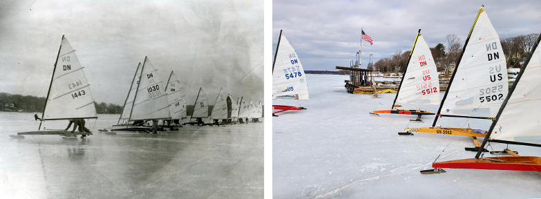 Because of their low resistance to forward motion over ice, iceboats are capable of exceeding speeds of 60 miles per hour. Iceboats are classified based on adherence to “one design” structure and/or by the amount of sail area. Antique wooden ice yachts are typically “stern steers”, thirty to forty feet long with gaff-rigged sails over 250 square feet. The fastest boats are called A-skeeters. These are one design, hold one person, and carry 75 square feet of sail. Then there’s the Yankee class: a two-seater, one design boat. The DN (Detroit News) is the most popular one design boat in the U.S. and Europe. It has an opened cockpit and 60 square feet of sail area. You’ll find all kinds out on the ice of Lake Hopatcong and Budd Lake when conditions are just right!