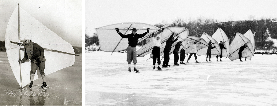 To skate sail, one holds a sail in one’s hands or leans it against the windward shoulder, using the power of the wind to glide. This can also be done on skis or other sliding footwear but was popularized on skates. The sail is generally rectangular or triangular and about 50 to 60 square feet large, but the “Hopatcong Sail” was a favorite of the SSAA and was more rounded. Back then, the sail was typically made of muslin, lightweight sailcloth, balloon silk, or nylon. Long, tubular racing skates, 16 to 18 inches in length, were used and speeds of up to 55 miles per hour were recorded! Unfortunately, by the second half of the twentieth century, the sport was little practiced, but there are still folks on the lake who have memories of skate sailing and, on rare occasions, a skate sailor can be spotted out on the ice!