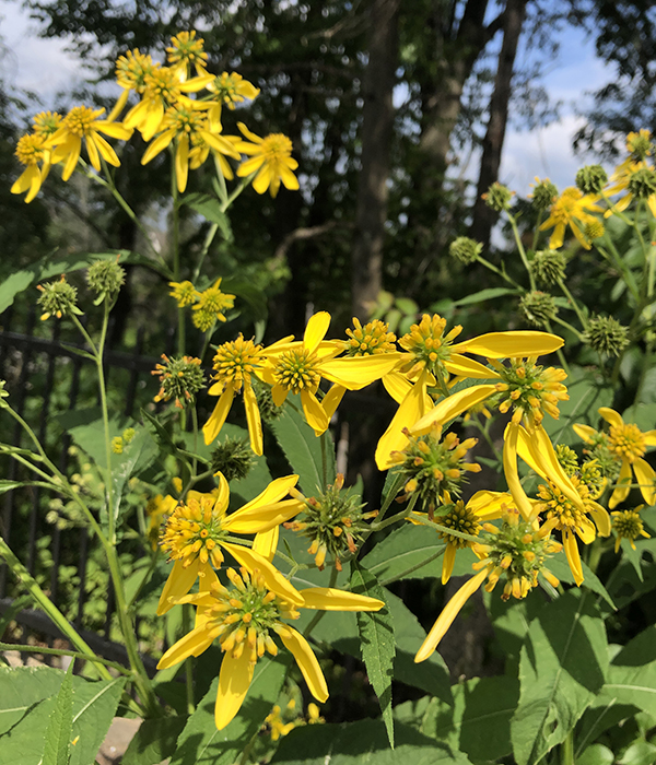 Not often used in the home garden, Wingstem (Verbesina alternifolia), also known as yellow ironweed, is becoming one of our favorites in our gardens. It is a member of the aster family and features clusters of perky yellow flowers often compared to pin cushions from August to October. Considered deer-resistant, this is a tall plant that can reach 6 feet or more. A favorite plant of bees, it also attracts butterflies and native birds, including goldfinches. Wingstem does well in full sun to partial shade and will reseed and spread. It is a host plant for the silvery checkerspot butterfly, summer azure butterfly, and gold moth. Native Americans used wingstem as a remedy for gastrointestinal issues and as an external treatment for joint pain.