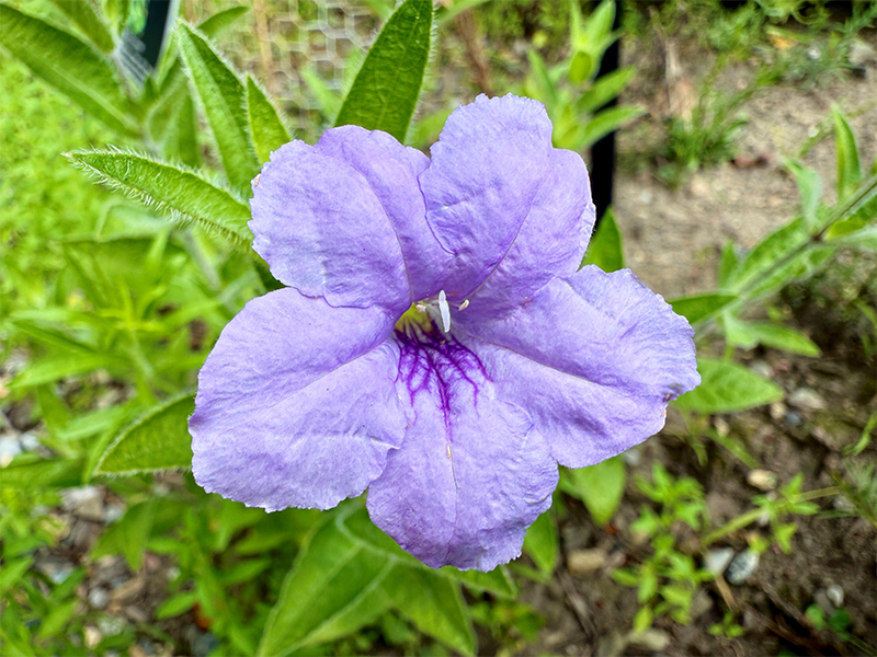 Wild Petunia (Ruellia humilis)Standing about 1' tall, wild petunia, known for its attractive purple flowers and drought resistance, will bloom throughout the hottest and driest summer weather. It is a hardy plant which attracts a wide variety of insect pollinators, as well as butterflies and hummingbirds.